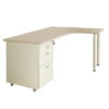 - Bàn góc trái 1.4m, 1.6m, 1.8m hộc sắt liền bàn 3 ngăn kéo, chân trụ tròn, mặt gỗ MFC. Không có giằng.